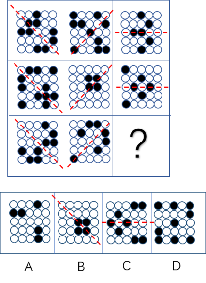 解 析:元素组成不同,优先考虑属性规律。观察发现,题干第一行中图1、图3以及第三行图1为W变形,第二行图3为箭头形变形,考虑轴对称。第一行图形对称性分别为左斜对称轴对称、右斜对称轴对称、水平对称轴对称。第二行验证满足规律(如下图所示)。第三行应用规律,那么?处应该选择水平对称轴对称的图形,四个选项中只有C项符合。