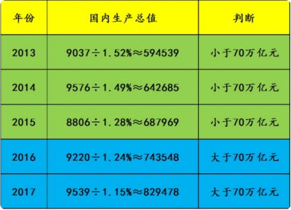 国内生产总值超过70万亿元的年份有2个,排除。