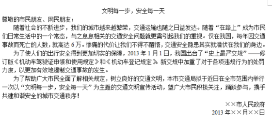 5、1.2013年1月1日,被称为“史上最严交规”的修订版《机动车驾驶证申领和使用规定》和《机动车登记规定》正式施行了。元旦期间,新交规中的“闯黄灯扣6分”一项引发车主及网民集体吐槽。公众对闯黄灯新规的批评和质疑主要集中在以下几个方面:其一,难以操作,有网友直言其“违背了牛顿第一定律”,因为行车有惯性,根本无法做到看到黄灯就刹住车;其二,很多地区绿灯并无倒计时,见黄灯亮起紧急刹车易引发追尾;其三,黄灯本就是一个缓冲区,“闯黄灯”就罚款让黄灯形同虚设;其四,由于担心闯黄灯被扣分,司机在“绿灯恐惧症”下会提前减速等黄灯,加剧了本就严重的城市拥堵;最后,此规定可能违法,因为按法律规定,黄灯是为警示,红灯才是禁止,按闯红灯处罚闯黄灯涉嫌违法。与此相对,相关部门在元旦节后公布了假期的交通事故率呈现大幅下降的数据。人类在进入汽车时代之后,享受到交通快捷所带来的便利,也同时被交通事故所困扰。仅在我国,每年因交通事故而死亡的人数,就高达6万,受伤人员更是在30万之巨。至于交通事故所造成的直接财物损失,以及随之而来的社会隐性损失,则是一个难以估量的天文数字。由此可见,控制交通事故发生率至关重要,而最简单有效的方法,就是人人都能遵守交通规则。从“史上最严交规”的具体规定来看,对各项违规行为的处罚力度加大,乃是出于遏制交通事故,提高违规门槛的角度,符合从严处罚交通违法行为的社会潮流。此前“醉驾入刑”实施后,就成功将醉驾、酒驾行为大幅度降下来,其所挽回的生命和社会财富,也是难以计数。针对各类“中国式”马路现象,新交规倡导的交通文明无疑是进步的,践行公共文明,需从每一个细节入手。2.“黄灯很忙”,不是人们无谓的抱怨,而是一种典型的“中国式焦虑”。这背后有人们对如此规定是否科学、是否尊重行车规律的怀疑,但更多的恐怕是对现实问题的焦虑。比如,焦虑万一黄灯亮了自己停不下来怎么办,并非有意为之却不得不面对严厉的处罚是不是有些冤;焦虑自己可能被追尾或者追尾他人,造成不必要的损失;焦虑本已时常拥堵的交通状况因为人们纷纷减速慢行而更加恶劣……如果在规定出台前,相关部门作了充分的调查和研究,充分听取了专家意见,并经过公共讨论,这些问题应该会在立规之初就被提出来,不至于在实施后遭遇这种执行困境和尴尬,以至法规陷入进退两难的境地:不改,问题重重难以执行和操作;改,可能影响立法和规制的严肃性与权威性。无论是立法,还是规制,之所以要开门让公众参与,除尊重公众知情权和参与权外,更是为了最大限度地吸纳民智和最大限度地减少争议。公众尽早参与讨论,不仅能发现问题,也能将各方意见尽早在博弈中融入法规,避免执行后的争议和反对。如果闭门立法,法规在实施后必然会遭遇极大阻力,被排斥在立法之外的民众,会在法规实施后以不合作、不服从、不遵守等方式抵制。2013新年伊始,这场关于“闯黄灯”的争论,无论结果如何,至少教会了我们应该怎样科学地制定规则。交通规则是最基本的规则,“黄灯”对我们的改革也有着深刻的隐喻,我们的政治、经济、日常生活中处处都有规则,如何区分公私权界,如何划定合法与非法的界限,这场争论是很生动的一课。3.面对新交规,到底是更便捷、更科学还是反倒麻烦了,不是一朝一夕就能定论的。“红灯停,绿灯行,黄灯亮了等一等”,这句交通警示语简明扼要,却往往被人无视。不可否认,在我们的生活中,闯红灯的现象随处可见,黄灯更是被很多人当作提醒:抓紧时间在变成红灯之前闯过去,却忘记了最该记住的原则:安全第一!严惩闯黄灯的初衷,实际上是在交通秩序中强调一种价值排序:车辆通行重要,生命安全更重要。黄灯有有限通行权,但交叉方向上的绿灯同样有通行权。是要绿灯通行时的顺畅安心,还是要黄灯通行时的放手一搏?严惩闯黄灯,正是在两个价值的权衡中,取了更有利于公众安全的一种。“车轮上的中国”,理应涵养形成机动车通过路口提前减速慢行、主动礼让行人的文明气象。当然,不容忽视的是,重罚闯黄灯的前提,应该是可以确定黄灯何时会亮,“随时会亮”的逻辑确实有点儿荒唐。在新交规中同样被加重处罚的遮挡号牌、开车打手机等行为,只要驾驶员注意,都可以避免。违法可能面临的后果、风险,都应该是驾驶员自己可以控制的。而要避免闯黄灯,显然没这么简单。浙江省公安厅交管局副局长宋某认为,民众关心的处罚问题其实并不是新规定的本意。处罚不是核心问题,关键问题是给司机“上根弦”,看到黄灯的时候脚踩的不是“油门”而是“刹车”,将因抢黄灯而造成的交通事故降到最低。“让更多的人开上汽车,这是发展;让更多车主遵守规则,这是文明。”许多网友在广泛转发这条微博时表示,期待“史上最严交规”能够托起“马路文明”,为“中国式出行”破题。 【问题】 某市有关部门拟在新交规出台之际举行一次关于建设交通文明的宣传活动。请你参考“给定资料1~3”,为该市政府网站写一篇宣传稿。 要求:(1)内容具体,切合主题;(2)准确全面,逻辑清楚;(3)不超过400字。