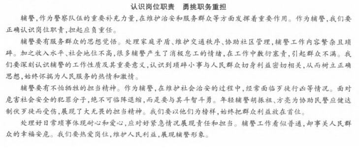 3、写作题 胡振祖,男,1994年12月出生,永康市公安局花街派出所辅警。 方亮,男,1996年7月出生,永康市公安局花街派出所辅警。 2017年8月8日晚,永康市公安局花街派出所接到报警,称花街镇黄园村某酒家发生纠 纷。辅警胡振祖、方亮跟随民警应健达迅速赶往现场处置。三人到达现场后看到,一名男子正用手臂夹住一女子的头部,用刀割刺女子的颈部,情况十分危急。应健达和胡振祖、方亮立即扑上去解救,应健达的手背、手臂、肩颈被刺中多刀,胡振祖、方亮两人身中多刀,但两人始终死死钳住行凶男子不放,给应健达赢得了宝贵的时间。最终,男子被应健达开枪制伏。经鉴定,胡振祖胃破裂,左侧腹直肌断裂,左大腿、右脚等多处被割伤,失血超2000毫升,经抢救脱离生命危险,受重伤;方亮右脸、左胸、左大腿等多处被刺伤,左肘肌肉严重损伤,肌腱部分断裂,受轻伤。 此前,金华市表彰了2018年度被市政府记二等功并授予“金华市见义勇为勇士”和“金华 市见义勇为积极分子”称号的10名先进人物。胡振祖和方亮被授予“金华市见义勇为勇士”称号,并记个人二等功。根据材料,谈一谈你对辅警工作的认识,结合报考岗位,写一篇300~500字的作文。