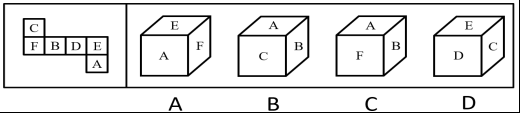 解 析:逐一进行分析。 A项项:选项与展开图一致,当选; B项:面A和面C是相对面,相对面不能同时出现,排除; C项:选项出现面B,面F,上面的面应该是面C而不是面A,选项与展开图不一致,排除;D项:选项出现面D,面E,右侧的面应该是面A而不是面C,选项与展开图不一致,排除。故正确答案为A。
