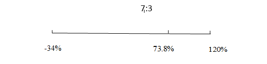如图所示,设一件羽绒服成本为100元,最初定价为100×(1+120%)=220元,打折后售价为220×0.3=66元,打折后利润率为(66-100)÷100=-34%。由距离比与量之比成反比可知距离比为7:3。则混合后的利润率=-34%+(120%+34%)×7/(7+3)=73.8%。