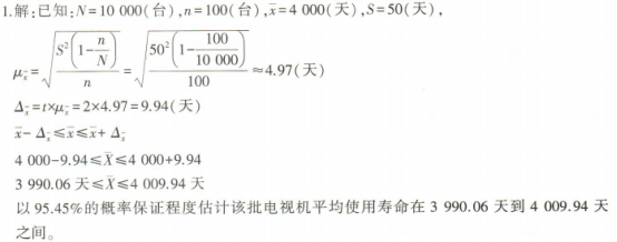 1、从某工厂生产的10000台电视机中,按简单随机不重复抽样方式抽取100台进行使用寿命测试,经检验100台电视机的平均使用寿命为4000天,标准差为50天。试以95.45% (t=2) 的概率保证程度估计该批电视机平均使用寿命的区间。