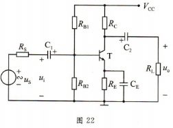 1、实验室购进了一批晶体三极管,实测得这批三极管的β约为200,计划用该批晶体三极管替代原实验电路板上的晶体三极管。原实验电路如图22所示,已知RL=1kΩ,C1=C2=10μF,CE=10μF,VCC=12V,静态时的VCE=6V,电压放大倍数AV约为45,晶体三极管的β为110。在维持原电路的负载、电源电压和静态时的VCE均不变,放大倍数基本不变的条件下(假设RS忽略不计)。