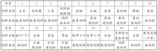 玉米、马铃薯、小麦、饲料级硫酸铜、蔗糖、豆粕、尿素、菜籽粕、棉粕、麦秸、桑叶(干)、石粉、食盐、骨粉、胡萝卜叶、白萝卜叶、水稻、多种维生素添加剂(兽用)、豆秸、紫花苜蓿(干草)(依次编号为 1~20)。