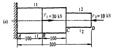 2、如图1-3-24所示一阶梯形钢杆,已知杆的弹性模量E=200GPa,AC段 的截面面积为AAB=Apc=500mm²,CD段的截面面积为Acp=200mm², 试求: