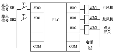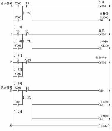 2、给一个锅炉设计点火和烧火控制PLC程序,控制要求为:点火过程为先启动引风,5分钟后启动鼓风,2分钟后点火燃烧;熄火过程为先熄灭火焰,2分钟后停止鼓风,5分钟后停止引风。根据控制要求,设定PLC的I/O点的确定与分配如表3: