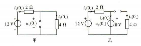 画出t=0+时的等效电路,此时电容用一个电压为8V的理想电压源代替,如图乙所示。