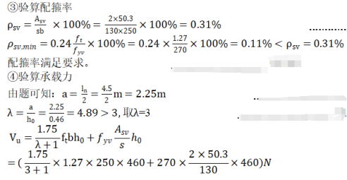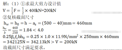 1、某矩形截面简支梁,截面尺寸b×h=250mm×500mm,梁净跨ln=4.5m,集中荷载作用在跨中,荷载设计值F=400kN,混凝土强度等级为C25(fc=11.9N/mm2,ft=1.27N/mm2),配有箍筋为ϕ8@130的双肢箍。(提示:fyv=270N/mm2,Asv1=50.3mm2,梁自重忽略不计,as=40mm,βc=1.0) (1)验算斜截面承载力是否满足要求; (2)若该梁斜截面承载力不满足要求,在不改变荷载的前提下,则可采取哪些提高措施?(不少于五点)
