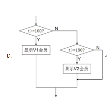 1、某饮品店采用会员积分消费模式。顾客扫描店铺二维码关注公众号,输入手机号及个人资料注册后即成为普通会员,每消费10元可积1分。消费积分累计100分,升级为V1会员,享受8折消费优惠;消费积分累计180分,升级为V2会员,享受7折消费优惠。用算法流程图描述“消费积分累计100分,升级为V1会员;消费积分累计180分,升级为V2会员”的问题,用t表示顾客的消费积分,下列选项不正确的是( )