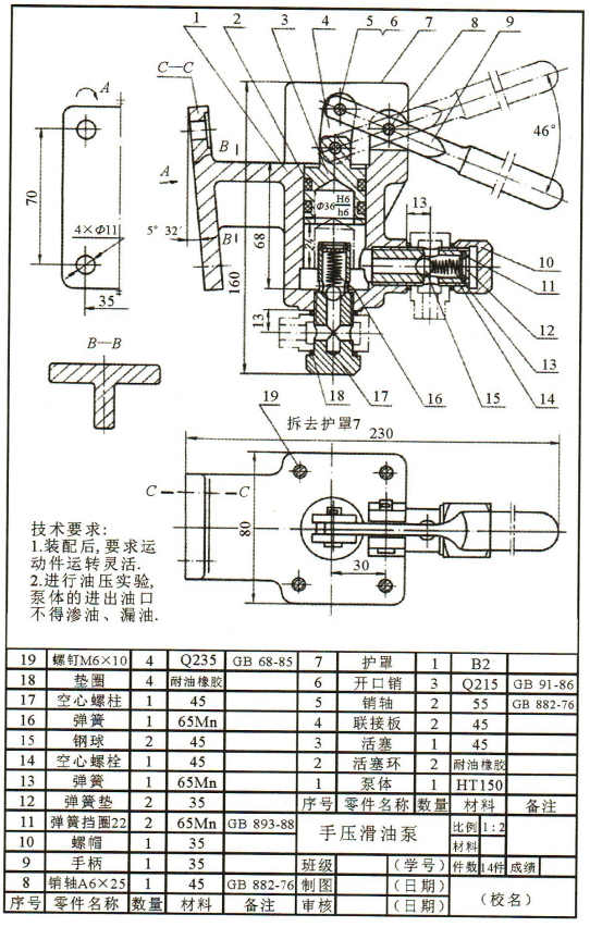 解 析:手压滑油泵通过改变活塞位置形成密封容积的变化,从而实现吸油与压油。当手柄向下时,活塞向上,密封容积增大,下方钢球被顶开,完成吸油(下方为吸油口)当手柄向上时,活塞向下运动,密封容积减小,右侧钢球被顶开,完成压油(右侧为出油口)。图中细双点画线表示运动极限位置与相邻零件的画法属于假想画法。主、俯视图中手柄都采用了断裂画法。A向斜视图,只画了二分之一,在对称线两端的两条平行细实线应称为对称符号。手柄摆动角度范围为46°,活塞上下移动距离范围为24。
