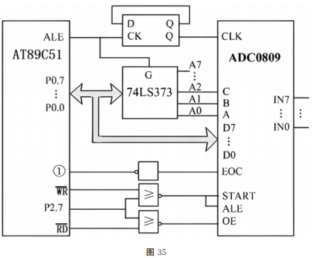 2、如图35所示,AT89C51单片机通过ADC0809进行模数转换,采用中断控制方式,请写出图35中①所对应的引脚符号,并填写程序或注释中的空白部分②~⑤。