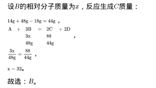2、在化学反应A+3B=2C+2D中,若参加反应的A、B的质量分别为14g、48g,生成D的质量为18g,C的相对分子质量为44,则B的相对分子质量是()