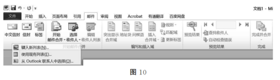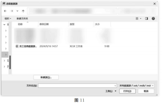 (1)首先准备好员工工资信息数据源→依次单击如图10所示菜单中的“邮件”→“选择收件人”按钮→“①”命令→弹出如图11所示对话框→选择员工信息数据