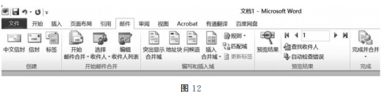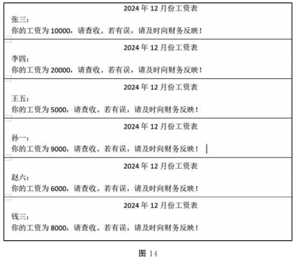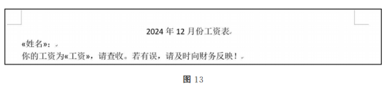 (2)在如图12所示界面中,依次单击“邮件”菜单→“②”按钮→将姓名、工资信息插入到模板里→效果如图13所示;