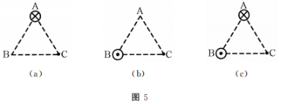 1、如图5所示,A、B、C分别位于等边三角形的顶点处,当分别在A、B处通人垂直纸面的直流电流I时,测得C点处的磁场强度均为H,如图(a)、(b)所示。若在A、B处同时通人直流电流I,如图(c)所示,此时C点处的磁场强度为