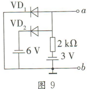 2、如图9所示,VD1和VD2为理想二极管,(1)VD1的状态为()(填导通/截止);(2)电压为Uab=()V。