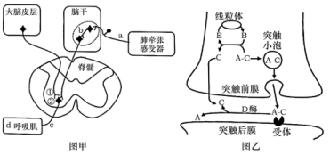 (1)图甲中,a、c、d是肺牵张反射弧的组成部分,b是________________,c是______________,d是________________。