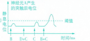 分析图乙,单独刺激B和单独刺激C都不能达到阈值,根据题干信息“突触前膜释放少量神经递质时,突触后膜会产生一个小电位,此小电位可以叠加”可推测,同时刺激B和C电位能叠加,从B和C单独刺激产生的电位值分析,同时刺激B和C的电位叠加后能够超过阈值,因此画曲线时,动作电位需超过阈值,产生兴奋,可绘制图形如下: