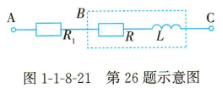 3、如图1-1-8-21所示,未知电感线圈与一个定值电阻R1串联后接到交流电源上。交流电源的频率f=50Hz,定值电阻的阻值R1=5Ω。现在用一个交流电压表测量出三个电压值,分别是交流电源两端的电压UAC=56V,定值电阻R1两端的电压UAB=10V,电感线圈两端的电压UBC=50V。请你根据以上数据计算出未知电感线圈的直流电阻R和自感系数L分别是()。