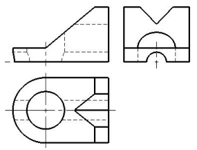 解 析:该组合体的外形是 U 形体,用正垂面和一水平面切去左上角,再左右切 V 形通槽,故先画出 V 形槽的俯视图投影。组合体从上向下切圆通孔,该圆孔的右半部分在正垂面上切下,所以其左视图应画出圆柱的斜切截交线;最后一个孔为左右半圆通孔,该孔与外圆柱和上下圆孔分别相贯。