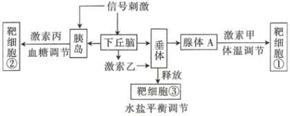 (1)若图中腺体A能分泌含碘的激素,则腺体A的名称是___________;若信号刺激是低温,则参与体温调节的激素除了激素甲外,还可能有___________(填激素名称)等参与。
