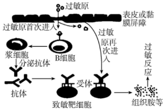 解 析:A、第一道防线是由皮肤和黏膜构成的,A正确;B、体液免疫中抗体分布和发挥作用的部位是血浆,过敏反应中抗体最终分布和发挥作用的场所是致敏靶细胞,B错误;C、由图可知,过敏原再次进入机体,与致敏靶细胞上抗体结合,C正确;D、组织胺是一种化学物质,引起毛细血管扩张的过程属于体液调节,D正确。故选B。