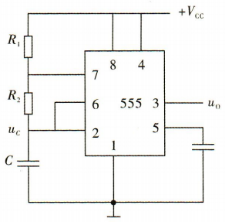 解 析:由555时基电路组成的典型多谐振荡器的电路如图所示,其振荡周期T=0.7(R1+2R2)C。