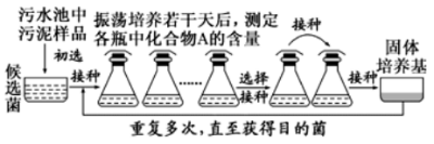 1、某化工厂的污水池中含有一种有害的难以降解的有机化合物A,研究人员用化合物A、磷酸盐、镁盐以及微量元素等配制的培养基,成功筛选到能高效降解化合物A的细菌(目的菌).实验的主要步骤如图所示。下列有关叙述错误的是()