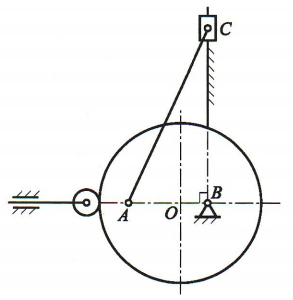 1、如图所示组合机构由曲柄滑块机构和凸轮机构组成,动力从滑块C输入,已知凸轮的工作轮廓为半径等于30mm的圆,OB=10mm,OA=20mm,AC=60mm,滚子半径为5mm,试回答下列问题。