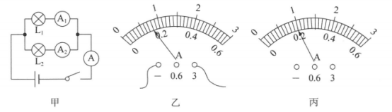 1、如图甲所示的电路中,两个灯泡 L1、L2并联,闭合开关,电流表 A2的示数如图所示。电流表 A 1和A 的指针都指向同一刻度,如图丙所示。下列说法正确的是()