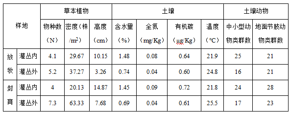 2、科研团队选择某牧区两块灌丛草地分别采用了放牧和封育管理两种处理措施。27年后调查发现,封育样地灌丛高度显著大于放牧样地,其它调查结果见表。