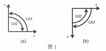 2、判断数控车床(只有X、Z轴)圆弧插补的顺逆时,观察者沿圆弧所在平面的垂直坐标轴(Y轴)的负方向看去,顺时针方向为G02,逆时针方向为G03。通常,圆弧的顺逆方向判别与车床刀架位置有关,如图1所示。正确的说法有()。