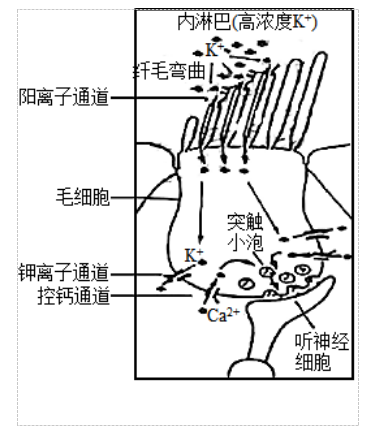 (1)声波振动引起毛细胞顶部的纤毛弯曲,使阳离子通道开放,通过 ______(跨膜运输方式)导致K+内流;此时声音信号转换为 ______,产生的兴奋经传导进一步触发细胞底部的Ca2+内流。Ca2+内流导致 ______被释放后与听神经细胞 ______上的受体结合,使听神经细胞产生神经冲动,传至大脑皮层相应中枢形成听觉。