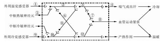 2、下图是人体体温调节部分过程示意图,来自外周(皮肤、黏膜、内脏等)和中枢温度敏感神经元的神经冲动经汇集、整合后引起人体产生相应生理反应,图中①~⑫代表神经元,“+”和“-”分别表示兴奋和抑制。请回答下列问题: