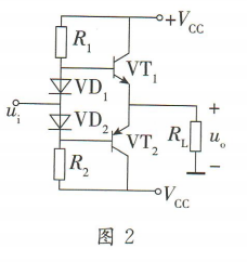 2、如图2所示,VT1管和VT2管的饱和管压降为|UCES|=3V,负载RL=8Ω,VCC=15V。则最大不失真输出功率Pom及此时的输入电压有效值U分别为()