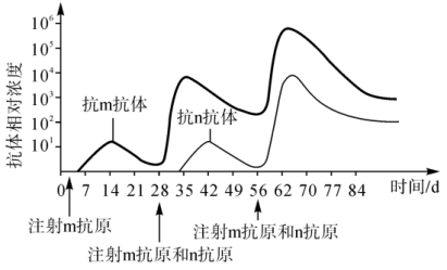 (3)在第56天注射m抗原和n抗原之后,该动物体针对m抗原和n抗原产生的抗m抗体和抗n抗体的浓度存在较大差异,其原因是()。结合题图,能为个体提供更有效保护作用的疫苗接种措施是()。