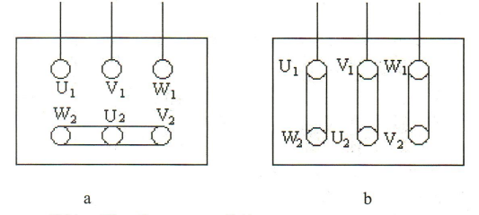 1、图是三相异步电动机接线图,图a为()接法,图b为()接法,