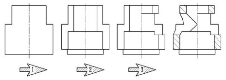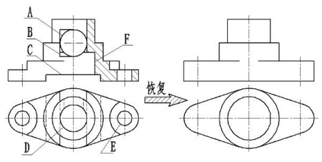 答 案:因用单一剖切平面通过左右对称平面剖开,且按投影关系配置,中间无其他图形,故不需进行标注。画图时,先画出位于剖切面上叠加部分的外轮廓线,再画出下方切槽结构 C,然后画出钻孔结构 D、F,在此基础上画出前方切槽结构 B,后方钻孔结构 A,打上剖面线,解题过程参下图所示。