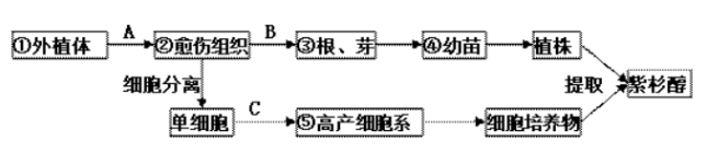 1、红豆杉是濒危植物,且其树皮产生的紫杉醇对癌症有一定的疗效。下图是红豆杉植株组织培养和细胞培养并提取紫杉醇的流程图。请据图回答。