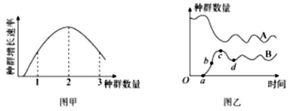 解 析:(1)活动能力大的动物如鱼类常用标志重捕法,其步骤是确定调查对象→捕获并标志个体→重捕并计数→计算种群密度。标志重捕法运用过程中,为确保调查数据的准确性,需注意标记不可易脱落,不可过于醒目,不影响生物的正常活动。根据图乙,若A、B两种鱼类的种间关系为捕食,A的数量先下降低,最有可能为被捕食者。 (2)图甲中,随着种群数量的增加,增长速率先增大后减小,种群数量达到3时,接近K值,基本符合S型增长,在图乙中的对应曲线B。图甲中2增长最大,种群数量未达K值,对应图乙中的b点。 (3)要持续地获得最大捕获量,应使鱼的增长率始终保持在较高水平,在被捕捞后保持在图甲中2水平,此时种群快速增长,年龄组成为增长型。 故答案为: (1)标志重捕法;标记不可易脱落,不可过于醒目,不影响生物的正常活动;A (2)B;b (3)2;增长型