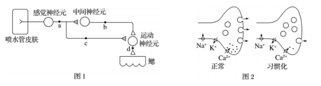 (3)经研究发现,给海兔喷水管施加弱刺激时,突触前的轴突末梢内流,促进了神经递质的释放,若每隔1分钟给海兔的喷水管重复此种弱刺激,缩鳃反射将逐渐减弱甚至消失。由图2得知,缩鳃反射减弱甚至消失的机理是______。