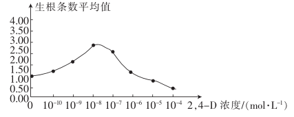 解 析:(1)该实验是探究不同浓度的生长素类似物2,4-D对促进月季扦插枝条生根的影响,自变量为2,4-D溶液浓度,还可以用根的长度等作为实验观察的指标。通过实验结果可得,在10-8mol·L-1的浓度之前,随着2,4-D溶液浓度增大,生根效果逐渐增强;在10-8~10-6mol·L-1的浓度范围内,随着2,4-D溶液浓度增大,促进作用逐渐减弱;2,4-D溶液浓度大于10-6mol·L-1之后,抑制生根。 (2)预实验为进一步的实验摸索条件,也可以检验实验设计的科学性和可行性。