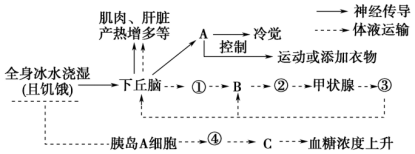 2、如图为某人在饥饿时参加冰桶挑战,其体内的一些生理变化过程示意图(图中①~④为激素,A、B、C表示器官、组织或细胞)。请据图回答下列问题: