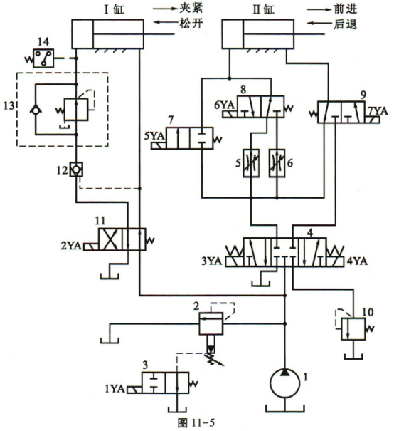 1、(2018年高考题)如图11-5所示为某液压传动系统的原理图,该液压系统能完成“I缸夹紧→Ⅱ缸快进→Ⅱ缸→工进→Ⅱ缸二工进→Ⅱ缸快退→I缸松开→卸荷、停止”的工作循环,件5比件6的节流口通流面积大,试回答下列问题: