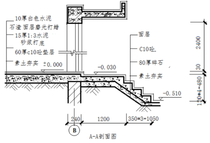 2、某房屋外墙门厅入口平面图如题43图所示,门洞上方过梁兼雨蓬梁,为钢筋砼过梁,截面尺寸为b×h=240mm×300mm,雨蓬和雨蓬梁整体现浇,悬挑宽度为1200mm,为有组织排水,室内地面为水磨石地面,台阶为砼实铺台阶,墙厚为240mm,请绘制A—A剖面图(剖切高度到雨蓬上方为止),标注轴线编号,标注横向和竖向尺寸及室内地面、休息平台和室外地面的标高,分别在剖面图上绘制室内地面和台阶的构造层次图,并标明做法。