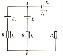 解 析:对节点A,由KCL有I1+I2=I3;对左侧回路,沿顺时针方向,由KVL有E1-E2=I1R1-I2R2;对右侧回路,沿顺时针方向,由KVL有E2+E3=I2R2+I3R4。联立解得