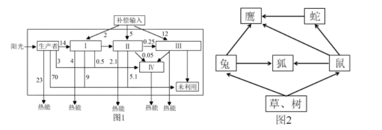 (1)如图1所示,输入该生态系统的能量包括 ,一共为 ×103 kJ/(m2•a),初级消费者营到次级消费者的能量传递效率为 (保留一位小数)。 (2)除生产者外其他营养级需要人为补偿能量输入的原因是 。 (3)图2所示食物网中,如果鹰体重增加1 kg,则最多消耗植物 kg,最少消耗植物 kg。 (4)已知该生态系统恢复后,能量从生产者到消费者的传递效率为10%,从消费者到消费者的能量传递效率为20%,且各营养级流向下一营养级的能量平均分配给各不同的种群(举例:草、树流向下一营养级的能量中50%进入兔种群,50%进入鼠种群)。若该生态系统一段时间内生产者固定的太阳能为1.5×1012 kJ,理论上狐可获得的能量为 kJ,鹰可获得的能量为 kJ。