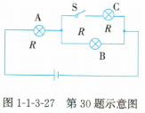 1、如图1-1-3-27所示,电路中A、B、C是三个规格完全相同的白炽灯,直流电源不计内阻,向电路供电,使三个白炽灯能发光。当开关S分别处于断开和闭合时,两种状态下白炽灯A消耗的功率之比为()。