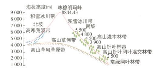 1、最新研究结果表明,珠峰地区的生态环境已经发生了巨变,植被增加趋势越来越明显。如图表示珠峰不同海拔高度地段的植被分布情况。回答下列问题: